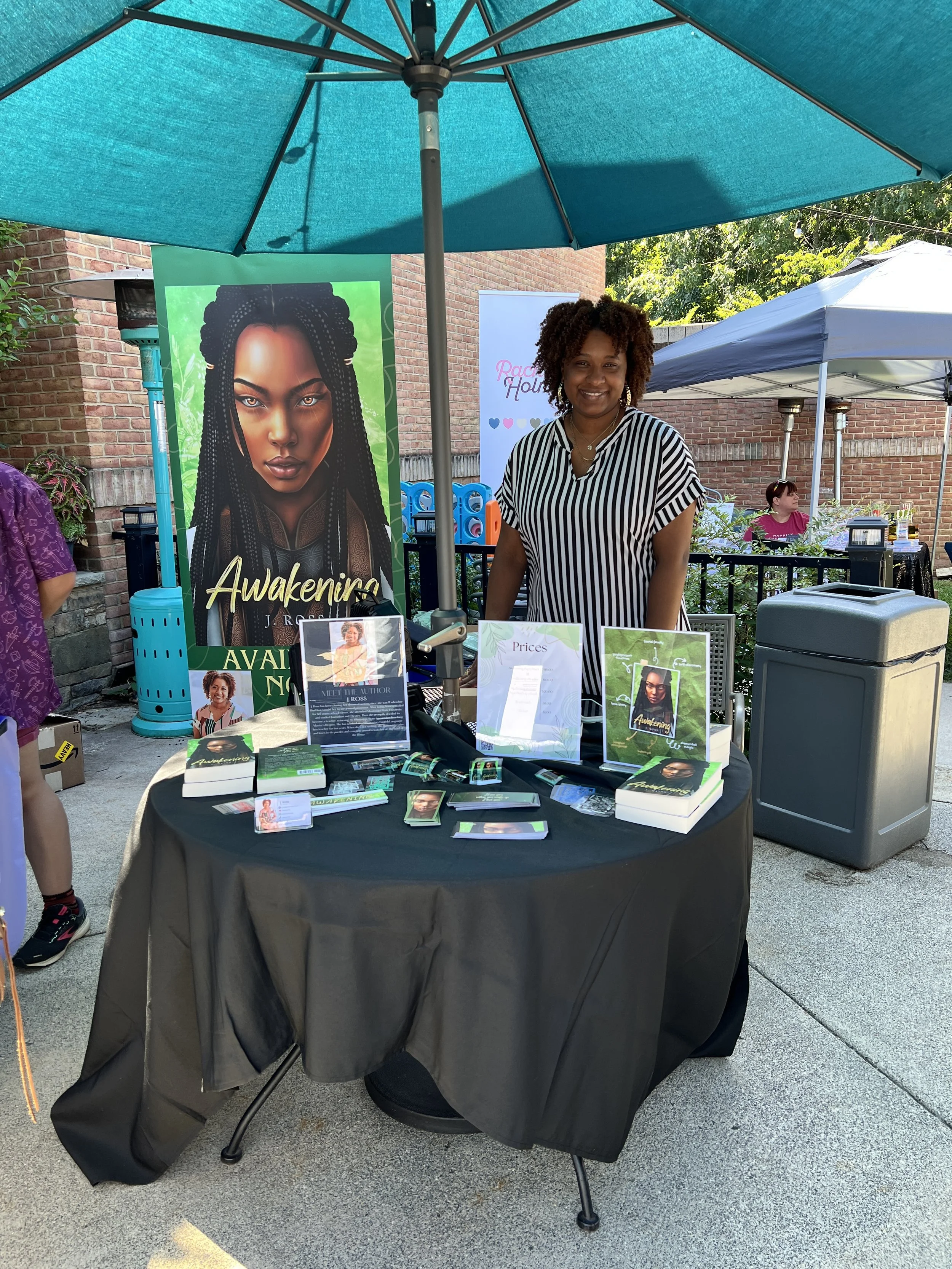 A woman is speaking into a microphone at a book signing event. A book titled 'Awakening' by J. Boss featuring a woman with braided hair is displayed on a table in front of her.